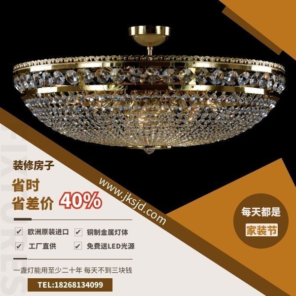 这款客厅圆形水晶吸顶灯,金色全铜灯架搭配透明高铅水晶,材质好稳定耐用,圆形灯体的设计让整体款式不调风格很百搭而且又耐看,报价还算比较实惠,而且到货期快只要一个月,在吉蒂灯饰家购买还送货上门,包安装,宋光源,提供全国联保两年质保等贴心服务。