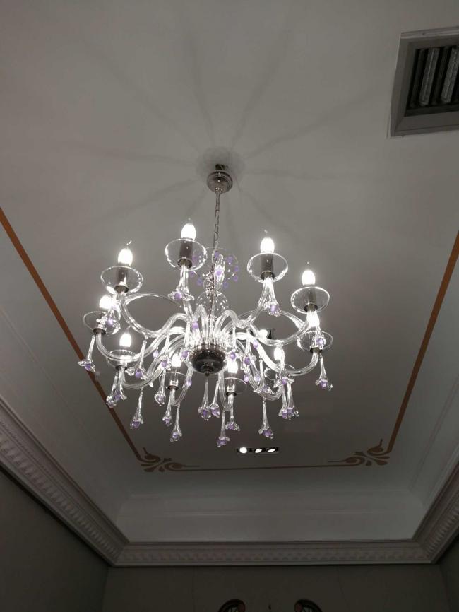 美丽的水晶灯绽放出耀眼夺目的光芒,显现出华丽尊贵的气质,倚仗一身通体晶莹的花瓣状垂饰,如若层层叠叠的晶莹果实,垂饰大小体形不一,装饰着宽阔的大厅,用灯光营造出富贵浪漫的氛围。