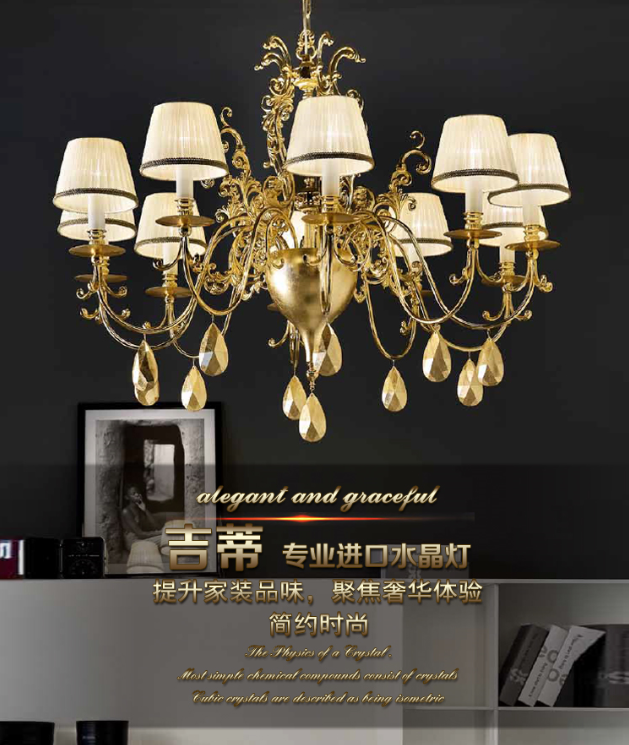 采用意大利全铜材质为灯架,金属部分为24K镀金,搭配素色淡雅布艺灯罩,让整体带有一种浑然天成的贵气与高雅。细腻的反复上色效果,搭配手工焊锡、压铸、雕刻技艺,使灯饰从整体灯形到垂饰、花纹等细节处的设计,无一部突出强调了材质的优越性能与隽永韵味。