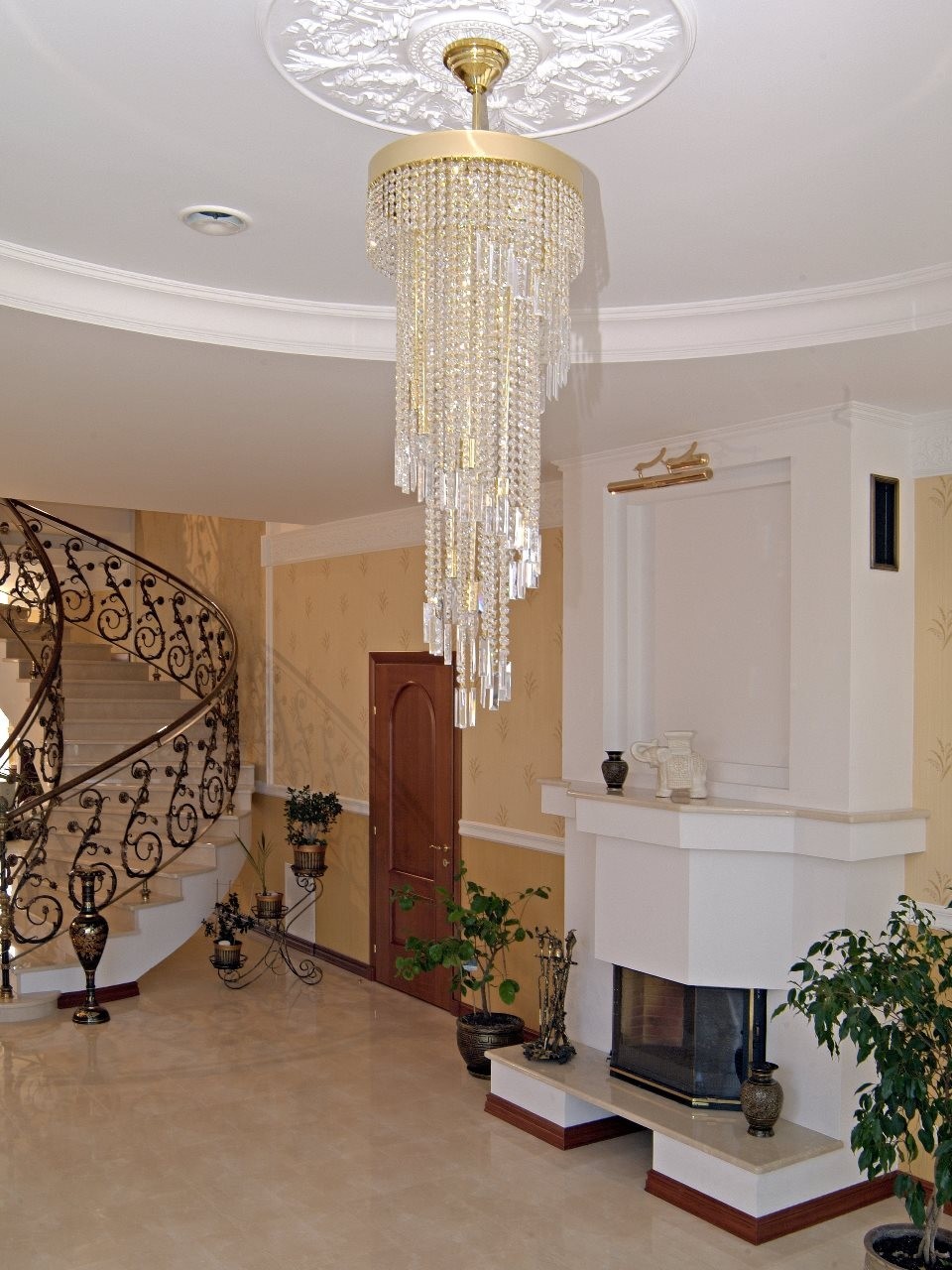 客厅应该是所有空间内较为宽敞的,主要以突显客厅的开阔大气与富贵堂皇,在选择水晶灯的时候需要考虑到其可以照明较大空间,也能烘托出客厅奢华气场的灯。