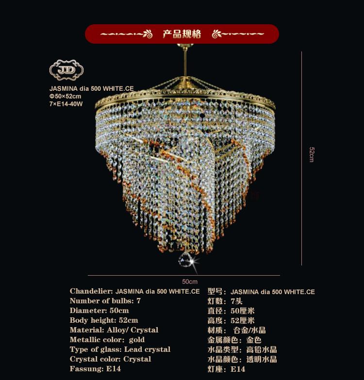 源自欧洲,水晶灯发源地—捷克。顶盘围绕串连着五层水晶串珠,串珠大小一致,皆为透明水晶,顶端珠帘之下分布着不规则呈递进的数层熟练,这些珠帘上方皆采用透明水晶,珠帘底部一颗水晶珠采用茶色水晶。透明水晶搭配茶色水晶给人以舒适的视觉感,切合吸顶灯金色合金顶盘,小编只能说设计师将色系的运用到满分。